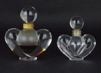 48 - 2pc LALIQUE 'COEUR-JOLE' PERFUME BOTTLES 2 Lalique French crystal perfume bottles having frosted glass bodies and lobes heart design. Each marked to underside. Largest measures 5 3/4" (14.6cm) height.