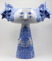 5 - BJORN WIINBLAD DANISH CENTERPIECE / COMPOTE Bjorn Wiinblad (Danish, 1918-2006) blue and white glazed ceramic centerpiece bowl in the form of a woman. Signed to underside and dated 1992. Measures 17" (43cm) height x 15 3/4" (40cm) width.