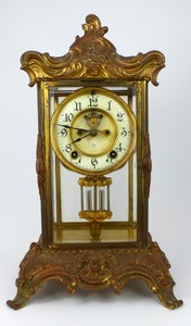 7 - ANSONIA GILT BRASS MANTEL CLOCK Ansonia gilt brass and beveled glass mantel clock with enameled dial and beveled glass. Includes mercury tube pendulum and winding key. Marked to face. Measures 15 1/2" (39.3cm) height.