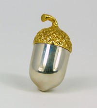 16 - TIFFANY & CO STERLING SILVER ACORN PILL BOX Tiffany & Company sterling silver pill box in the form of an acorn. Vermeil cover and box interior having a gold wash. Marked Tiffany & Co, 925 to side. Measures 1 3/4" (2cm) length.