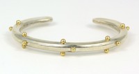 18 - TIFFANY & CO STERLING 14kt YG CUFF BRACELET Tiffany & Company sterling silver cuff bracelet having flattened ends and 14kt yellow gold accent bump decoration. Marked Tiffany & Co, Sterling, 14k. Measures 2 5/8" (6.6cm) width.