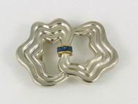 20 - TIFFANY STERLING 14kt & SAPPHIRE BELT BUCKLE Tiffany & Company sterling silver belt buckle having three sapphires set in 14kt yellow gold. From the 'Back to Glamour' collection. T & Co, STRG, 14K. Measures 2 1/4" (5.7cm) length.