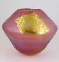 27 - ROBERT EICKHOLT IRIDESCENT ART GLASS VASE Robert Eickholt studio art glass vase having gold flakes design over an iridescent pink ground. Signed to underside and dated 1990. Measures 7 1/2" (19cm) diameter x 6" (15.2cm) height.