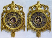 28 - PR SEVRES STYLE PORCELAIN PLATES IN GILT FRAMES Pair of Sevres style porcelain plates. Each cobalt ground with gilding and circular scene to center. Gilt wood frames having foliate and draped decoration. Each plate marked to underside. Plates measure 10 1/2" (26.5cm) diameter. Frames measure 24 1/2 (62cm)" x 15 1/2" (39.3cm).