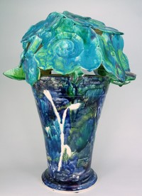 32 - ROBERT BEAU KVENILD CERAMIC BOUQUET SCULPTURE Robert 'Beau' Kvenild (American) contemporary ceramic sculpture in the form of a flower pot having blues, greens and purples throughout. Signed to underside. Measures 16 1/2" (41.8cm) height.
