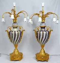 34 - PR ITALIAN GILT BRONZE & PORCELAIN 7-LIGHT LAMPS Pair of Italian 7 light table lamps. Each featuring a porcelain urn with ribbed design and hand painted floral motif with gilt bronze mounts. Each marked Made in Italy, FBAI to underside. Each measures 43" (109cm) height x 23" (58.5cm) diameter.