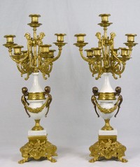 35 - PR ITALIAN BREVETTATO 7-LIGHT MARBLE CANDELABRA Pair of Italian Brevettato gilt metal and white marble 7-light candelabra. Having figural cherub and garland decoration to body and paw feet to base. Marked to underside Made in Italy, Brevettato. Each measures 23 3/4" (60.5cm) height.