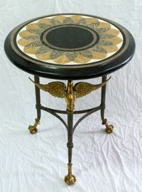 36 - MAITLAND SMITH INLAID STONE BRONZE SIDE TABLE Maitland Smith inlaid stone, iron and bronze side table adorned with three swans resting on ball and claw feet. Holds original label to underside. Measures 23" (58.5cm) diameter x 26" (66cm) height.