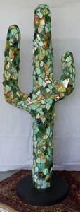 6 - TERRIE KVENILD MOSAIC CACTUS SCULPTURE 77" Terrie Read Kvenild (American, b. 1949) contemporary mosaic sculpture in the form of a Saguaro cactus. Decorated with pottery chard on round metal base. Signed to side of white pottery fragment. Measures 77 1/2" (196.8cm) height x 30" (76.2cm) width.