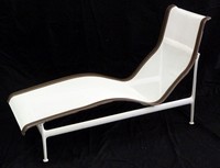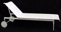 9 - RICHARD SCHULTZ FOR KNOLL ADJUSTABLE CHAISE LOUNGE Richard Schultz adjustable chaise lounge chair by Knoll having white mesh and brown vinyl trim on a cast aluminum frame. Measures 76" (193cm) length x 25" (63.5cm) width x 36" (91.5cm) height. Seat height 14" (35.5cm).