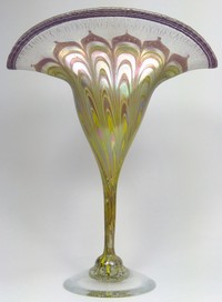 10 - VANDERMARK STUDIO ART GLASS FAN VASE Vandermark iridescent studio art glass fan vase having pulled feather with having gold, yellow and purple. Signed to underside. Measures 12 1/8" (30.8cm) height.