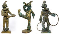 12 - 3pc PRINCE MONYO BRONZE CLOWN SCULPTURES 3 bronze sculptures depicting clowns or jesters by Prince Monyo Mihailescu-Nasturel (born 1926). One figure with rings, another with horn and final playing balalaika. Each signed to base and measures 13" (33cm) to 14" (35.5cm) height.