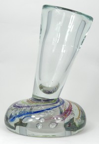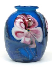 48 - JOSH SIMPSON FLORAL ART GLASS VASE Josh Simpson studio art glass vase having multi-layered floral decoration. Signed to underside, dated 1978 and numbered 78306. Measures 4" (10cm) height.