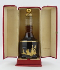 16 - BACCARAT PERFUME BOTTLE FOR HOUBIGANT Baccarat crystal perfume bottle decorated with gilt scene depicting figures in a garden. Marked Baccarat to underside. Holds John Wannamaker and Houbigant labels. Includes original presentation box. Bottle measures 7 3/4" (18.4cm) height.