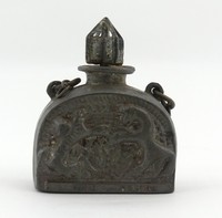 17 - PAUL POIRET ROSINE 'ALADIN' PERFUME BOTTLE Paul Poiret Rosine cast metal perfume bottle. Inscribed Aladin Rosine beneath each shield-like relief scene. Inscribed Aladin, Parfum de Rosine, Paris to underside. Measures 2 1/4" (5.7cm) width x 2 3/4" (7cm) height.