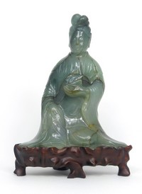 19 - 19th C CHINESE CARVED JADEITE MAIDEN 19th century Chinese carved jadeite figure of a maiden. Measures 5 5/8" (14.2cm) height + 1 1/4" (3cm) fitted wooden base.