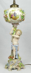 20 - CARL THIEME FIGURAL PORCELAIN LAMP Carl Thieme German porcelain lamp with cherub. Floral vignettes and applied flowers. Porcelain measures 15 3/4" (40cm) height. Overall 27" (68.5cm) height.