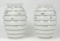 29 - PR CZECH MOTTLED WHITE GLASS SILVER OVERLAY VASES Pair of Czech mottled white glass vases of ribbed design. Decorated with silver overlay. Each marked 'Czecho Slovakia' to underside and measures 7 1/4" (18.4cm) height.