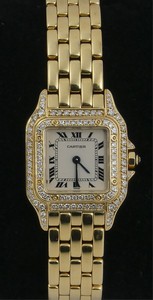 2 - CARTIER PANTHERE 18K GOLD & DIAMOND LADIES WATCH Panthere de Cartier 18k yellow gold and diamond ladies wristwatch. Quartz movement with white enamel face and black Roman numerals. 18kt yellow gold case with diamond-set bezel. Diamond-set crown. 18kt gold Cartier brick link bracelet with concealed double deployment clasp. Signed to dial, case and clasp. Secret signature at 7 o'clock. Case marked Cartier, Quartz, Swiss Made with hallmarks and numbered 8669199467. Case size 22mm. Internal circumference measures approx 6 1/4" (15.8cm). Total weight 44.6dwt. (69.3g).