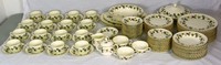 35 - 120pc ROYAL WORCESTER 'BACCHANAL' DINNERWARE 120 pieces of Royal Worcester porcelain dinnerware in the 'Bacchanal' pattern decorated with grapes and vines with gold trim. Includes 16 dinner plates-10 1/4", 16 salad plates-8", 14 soup bowls-8", 13 fruit/desert bowl-5 1/2", 16 bread and butter plates-6", 16 teacups-4 1/4", 14 saucers-5 3/4", 3 handled soup bowls-5 3/4", 4 saucers-6 1/8", 1 creamer-5", 1 covered sugar-5 1/4", 2 vegetable bowls-10 1/4", 1 covered casserole-10 3/4", 2 serving platters-15 1/2", 1 serving platter-13 1/2". Each piece marked to underside.