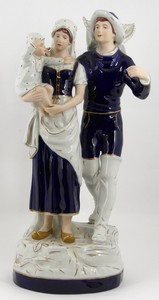 37 - ROYAL DUX 'FISHERMAN & FAMILY' PORCELAIN GROUPING Royal Dux porcelain group figure depicting a fisherman with his family. Hand painted blue and white with gilt decoration. Marked to underside. Measures 18 3/8" (46.7cm) height.