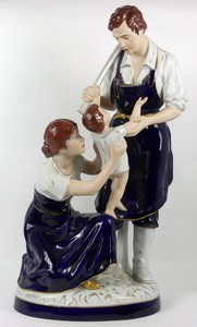 38 - ROYAL DUX 'BLACKSMITH & FAMILY' PORCELAIN GROUPING Royal Dux porcelain group figure depicting a blacksmith with his family. Hand painted blue and white with gilt decoration. Marked to underside. Measures 24 1/8" (61.3cm) height.