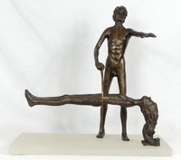3 - VICTOR SALMONES 'LEVITACION' BRONZE SCULPTURE Victor Salmones (Mexican, 1937-1989) bronze sculpture depicting a woman floating with male figure holding a hoop behind her. Signed to male's right foot and numbered 6/10. Mounted on a frosted acrylic base. Bronze measures 18" (45.7cm) height. Lucite base measures 19 1/2" (49.5cm) x 11 3/4" (30cm).