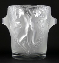 41 - LALIQUE FRANCE "GANYMEDE" FROSTED CHAMPAGNE COOLER Lalique French frosted crystal wine cooler ice bucket. Titled 'Ganymede'. Features frosted handled and raised figures in frosted relief with floral motif. Signed to underside. Measures 9" (22.8cm) height x 9 3/4" (24.8cm) width.