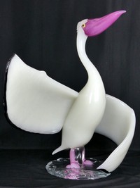 42 - PINO SIGNORETTO 'PELICANO' MURANO GLASS SCULPTURE Pino Signoretto (Italian, b. 1944) white, pink, black and clear Murano glass sculpture depicting a standing pelican. Signed to front of base. Measures 29 1/2" (74.8cm) height x 29" (73.6cm) width.