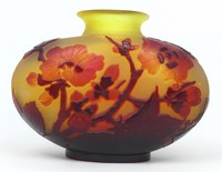 44 - EMILE GALLE 'BLOOMING FLOWER' CAMEO GLASS VASE Emile Galle cameo glass vase with flowers in bloom. Signed to side. Measures 4 7/8" (12.5cm) width x 3 5/8" (9.1cm) height. Purchased from Exquisite Antiques, Ltd., Bellmore, New York, 1978.