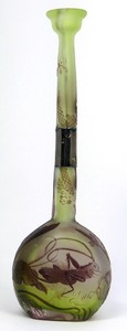 46 - EMILE GALLE 'GRASSHOPPER' CAMEO GLASS VASE Emile Galle cameo glass vase of banjo-form with slender neck and cupped rim. Depicts a grasshopper with prairie grass. Signed to side. Measures 8 1/4" (21cm) height. Metal collar to neck indicating probable repair.