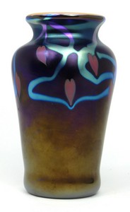 49 - DONALD CARLSON ART GLASS 'HEART' VASE Donald Carlson iridescent studio art glass vase having heart decoration. Signed to lower edge, dated 1977 and numbered 151. Measures 5" (12.7cm) height.