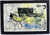 5 - PURVIS YOUNG OIL PAINTING ON PAPER Purvis Young (American, 1943-2010) oil painting on paper depicting a dog with glasses running and semi-truck trailer. Signed upper right. Measures 35" (89cm) x 23" (58.5cm) + 2 1/2" (6.3cm) mat.