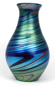 8 - LUNDBERG STUDIOS IRIDESCENT STUDIO ART GLASS VASE Lundberg Studios American studio art glass vase with swirl decoration. Signed and dated 1976 to underside. Measures 8" (20.3cm) height.