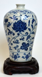 10 - CHRISTIES CHINESE MING BLUE & WHITE PORCELAIN VASE Chinese Ming blue and white porcelain vase of Meiping form. Baluster-form body rising to a lipped rim and resting on a slightly flared base. Decorated with lotus scrolls having buds in various stages of bloom, with curled and spiky trident leaves intertwined with branches of millet. Band of six lotus sprigs around base and scrolled vines around shoulder, separated with double line borders. Holds Christie's label to underside. Measures 10" (25.5cm) height. Provenance: Christie's Hong Kong, Lot 549, October 31, 1994.