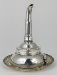 13 - TIFFANY & CO STERLING SILVER WINE FUNNEL w TRAY Tiffany & Company sterling silver wine funnel with strainer and tray. Marked Tiffany & Co with English sterling hallmarks to funnel, strainer and tray. Funnel measures 4 1/2" (11.4cm) length. Tray measures 3 7/8" (10cm) diameter. Total weight 4.8ozt.