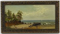 17 - CLINTON LOVERIDGE COASTAL OIL PAINTING ON BOARD Clinton Loveridge (American, 1838-1915) oil painting on board depicting a coastal landscape with boats in the distance. Signed lower right. Measures 9 3/4" (25cm) x 4 3/4" (12cm) + 3/4" (2cm) frame.