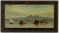 18 - CLINTON LOVERIDGE SEASCAPE OIL PAINTING ON BOARD Clinton Loveridge (American, 1838-1915) oil painting on board depicting a seascape with sailboat and small islands with mountains in the background . Signed lower right. Measures 9 3/4" (25cm) x 4 3/4" (12cm) + 3/4" (2cm) frame.