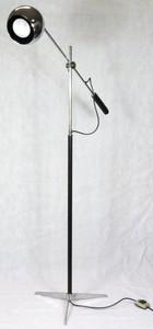 19 - ROBERT SONNEMAN ORBITER FLOOR LAMP Robert Sonneman mid-century modern chromed light on an adjustable metal arm with leather wrapped handle on cylindrical base with tripod foot. Measures 64 1/2" height (163.9cm) x 29" (73.6cm) width in its current position.