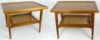 20 - PR KIPP STEWART 'DECLARATION' DREXEL SIDE TABLES Pair of Kipp Stewart for Drexel mid-century walnut end tables. Each with caning to lower shelf. From the 'Declaration' collection. Each measures 27" (68.5cm) x 22" (56cm) x 20 1/2" (52cm) height.