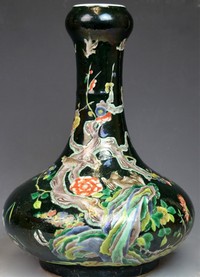 25 - CHINESE BLACK GROUND FAMILLE ROSE VASE Chinese black ground Famille Rose porcelain garlic head shaped vase. Decorated with floral branches and birds. Double concentric circles to underside. Measures 11" (28cm) height.