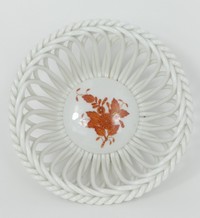 30 - HEREND CHINESE BOUQUET PORCELAIN BASKET BOWL Herend porcelain basket bowl with open weave design in the Chinese Bouquet Rust pattern. Marked to underside. Measures 5" (12.7cm) diameter.