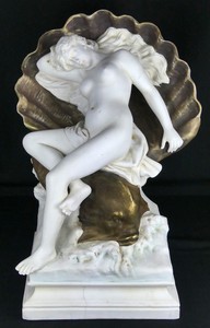 32 - FRENCH BISQUE PORCELAIN NUDE ON DOLPHIN OLIVERI Parian porcelain figure of Amphitrite on dolphin. Bisque with gilt accents. Signed Oliveri and impressed E B, PARIS. Measures 20" (50.8cm) height x 14" (35.5cm) width.
