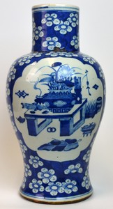 34 - CHINESE BLUE & WHITE PORCELAIN VASE Chinese blue and white porcelain vase decorated with floral pattern, featuring cartouches filled with various auspicious symbols. Measures 16" (40.5cm) height.