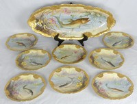 35 - 9pc LSS LIMOGES PORCELAIN FISH SET ARTIST SIGNED 9 piece Lewis Straus & Sons Limoges French hand painted porcelain fish set with gilt borders. Includes 8 plates and large serving platter. Each marked to underside and signed 'Francis' below image. Platter measures 24" (61cm). Plates measures 9" (23cm).