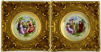 36 - PR ROYAL VIENNA PORCELAIN PLATES IN GILT FRAMES Pair of Royal Vienna porcelain plates in gold gilt frames. Each marked with Beehive and B&L to underside. Each plate measures 6" (15cm) diameter and each frame measures 9" (23cm) square.