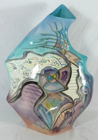 31 - GUY DAWSON STUDIO POTTERY SCULPTURE Impressive, large modern 'pinch and coil' undulating studio pottery sculpture by Guy Dawson. Three curved structures wrap around central structure of phallic-form enhanced with natural rock crystal formation. Four separate pieces, can be arranged as desired. Signed to side of center and two exterior structures. Measures 28 3/4" (73cm) height x 19" (48.2cm) width at widest point.
