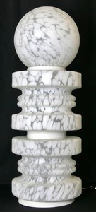 42 - MONUMENTAL VISTOSI MURANO GLASS TOTEM LAMP Mid-century modern Murano art glass sculptural totem lamp with globe by Vistosi. Three pieces of speckled white and clear frosted glass separated by white enameled metal spacers. Holds original labels inside glass. Measures 34" (86cm) height.