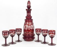 43 - 7pc BOHEMIAN CRANBERRY CUT TO CLEAR DECANTER SET 7pc Bohemian cranberry cut to clear decanter set. Includes decanter and six cordials. Decanter measures 10 1/8" (25.7cm) height. Cordials each measure 3 1/4" (8cm) height.