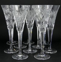 47 - 10pc WATERFORD MILLENNIUM SERIES FLUTED CHAMPAGNES 10 Waterford Millenium Series fluted champagne glasses. Includes two each of Health, Prosperity, Happiness, Peace and Love. Each marked to underside and measures 9 1/8" (24cm) height.